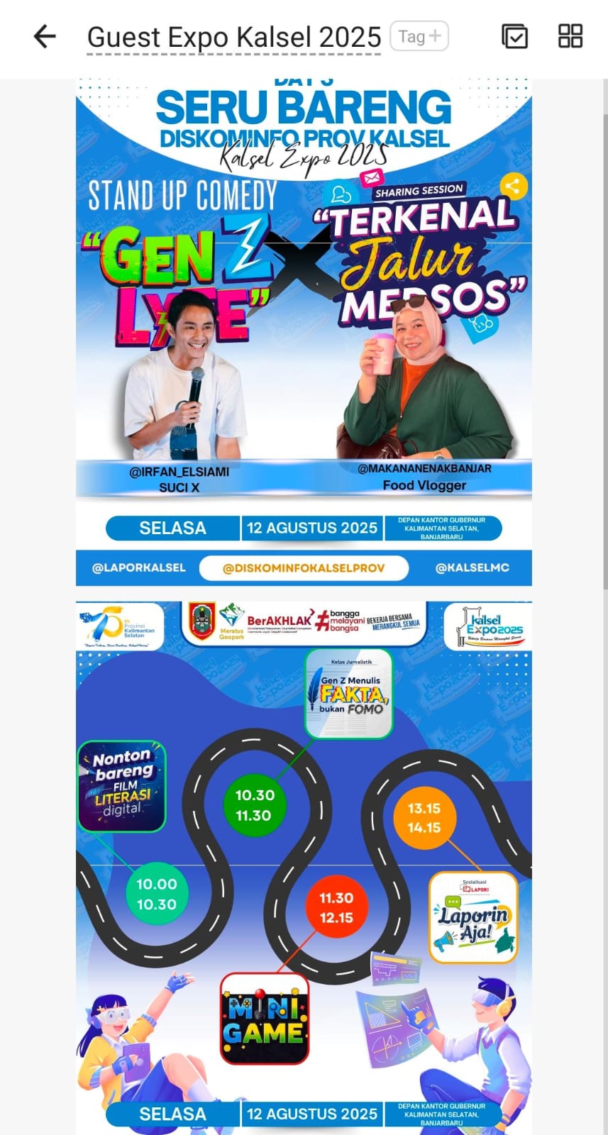 Salah satu daya tarik utama adalah sesi “Stand Up Comedy Gen Z Lyfe” dan “Sharing Session Terkenal Jalur Medsos” yang akan diisi oleh Irfan Elsiami & Suci X serta @makananenakbanjar (Food Vlogger).