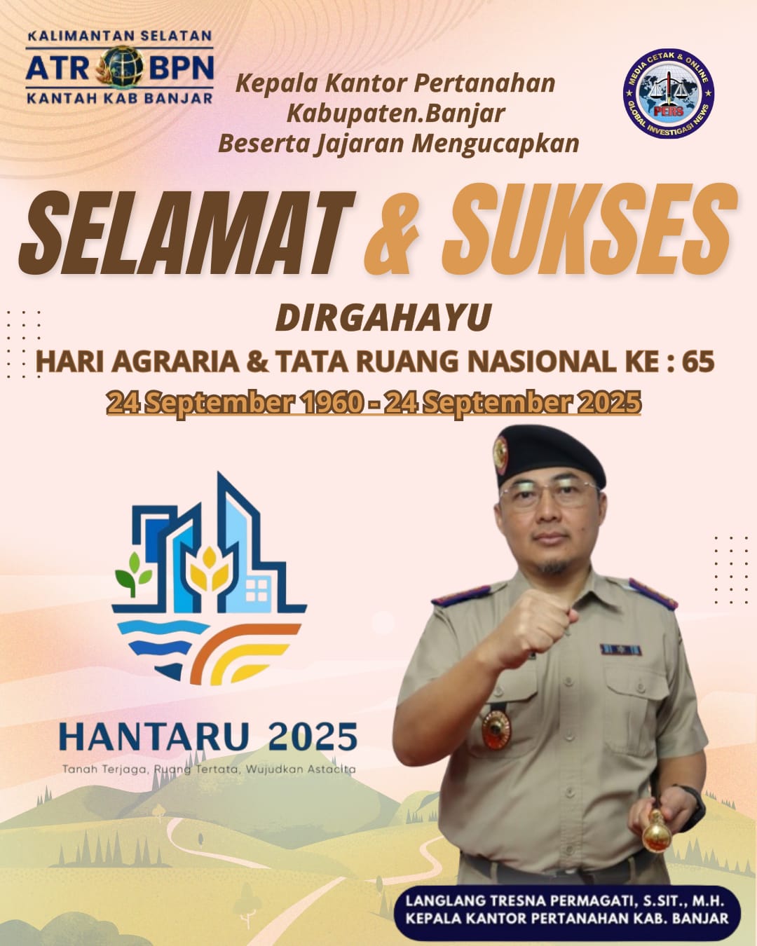 Banjarbaru, Kalimantan Selatan – Kepala Pertanahan Kabupaten Banjar, Langlang Tresna Permagati, S.SiT, M.H., memberikan apresiasi tinggi atas suksesnya penyelenggaraan acara peringatan Hari Ulang Tahun (HUT) Undang-Undang Pokok Agraria (UUPA) ke-65 yang diselenggarakan di Kantor ATR/BPN Provinsi Kalimantan Selatan, Banjarbaru, pada Rabu, 24 September 2025.